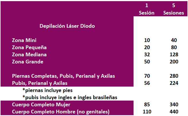 Facial Completo, Hombros, Medios Brazos, Medias Piernas, Dorsales, Lumbares, Abdomen, Pubis completo, Pecho, Glúteos.